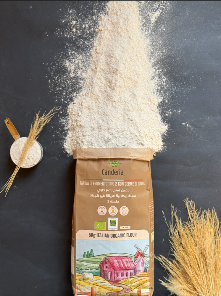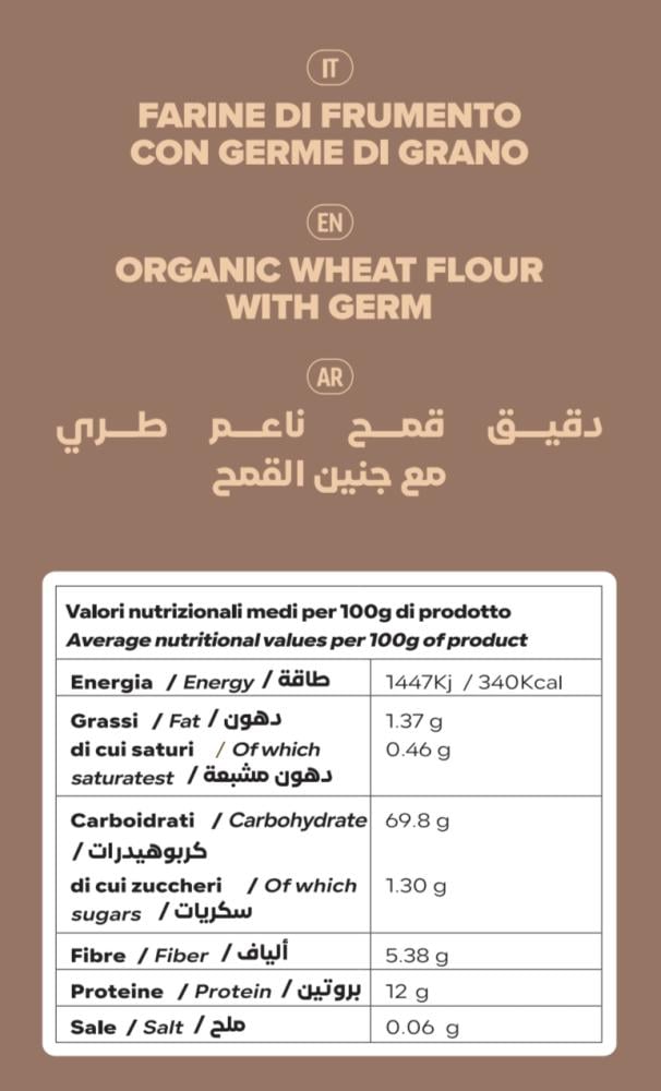 دقيق عضوي من سلالة إيطالية عريقة جدا يحتوي على جنين القمح، حيث يعتبر جنين القمح مركزٍ طبيعيّ غنيّ من العناصر الغذائية، والخصائص الصحية والنكهات المميّزة، يحتوي على فيتامينات B وE، دهون صحية (أوميغا)، بروتينات، ألياف، ومعادن مهمة كالمغنيسيوم والحديد والزنك، مما يجعله مكونًا أساسيًا في الغذاء المتوازن.